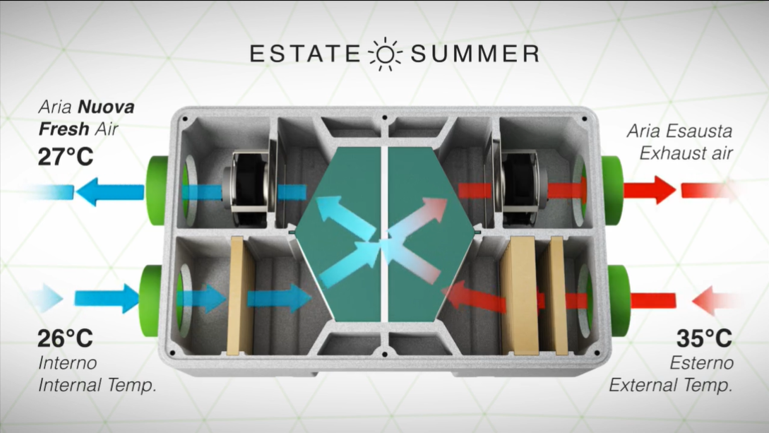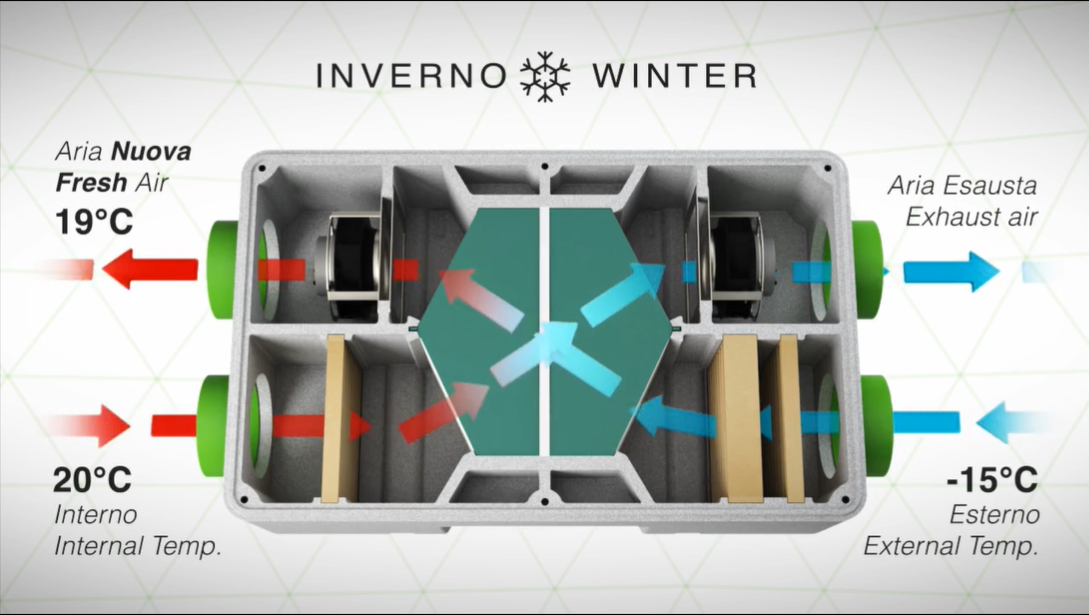 家用新风系统还具有全热交换芯,在夏天的夜晚,能利用室内排除的冷空气的质量,把室外的热空气预冷后再送入室内,室内冷量损失少;冬天则相反,会把室外的冷空气预热之后再送入室内,提高冬天的取暖效果。