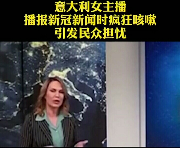 目前,意大利是除亚洲地区以外最大的新冠病毒爆发地,据当地媒体2月29日报道,意大利新闻节目TG5的新闻女主播在报道关于新冠肺炎的新闻时,突然当场狂咳不止,引发了当地民众的担忧。