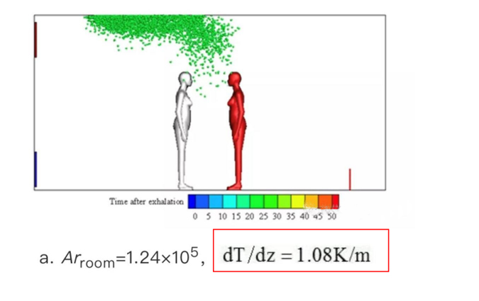 A:下图两人距离0.5m,置换通风不同温度梯度下飞沫分布云图(t=20s),由图可见,梯度温差越小,阻止飞沫传播越有利。