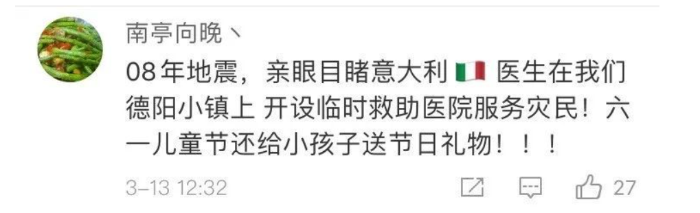 当地时间3月12日晚,由中国卫生健康委和中国红十字会共同组建的抗疫医疗专家组抵达罗马,并携带部分中方捐助的医疗物资。与此同时,许多意大利网友来到中国使馆的官方脸书主页,纷纷说“Grazie”(意为“谢谢”)。