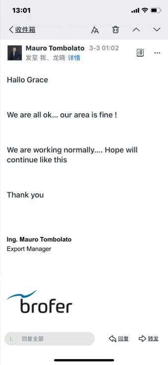 值此同时,我们也收到了意大利博洛弗公司总部出口部经理Mauro Tombolato先生发来的邮件,他表示“我们一切都好,工作正常开展,希望一直保持下去……”。