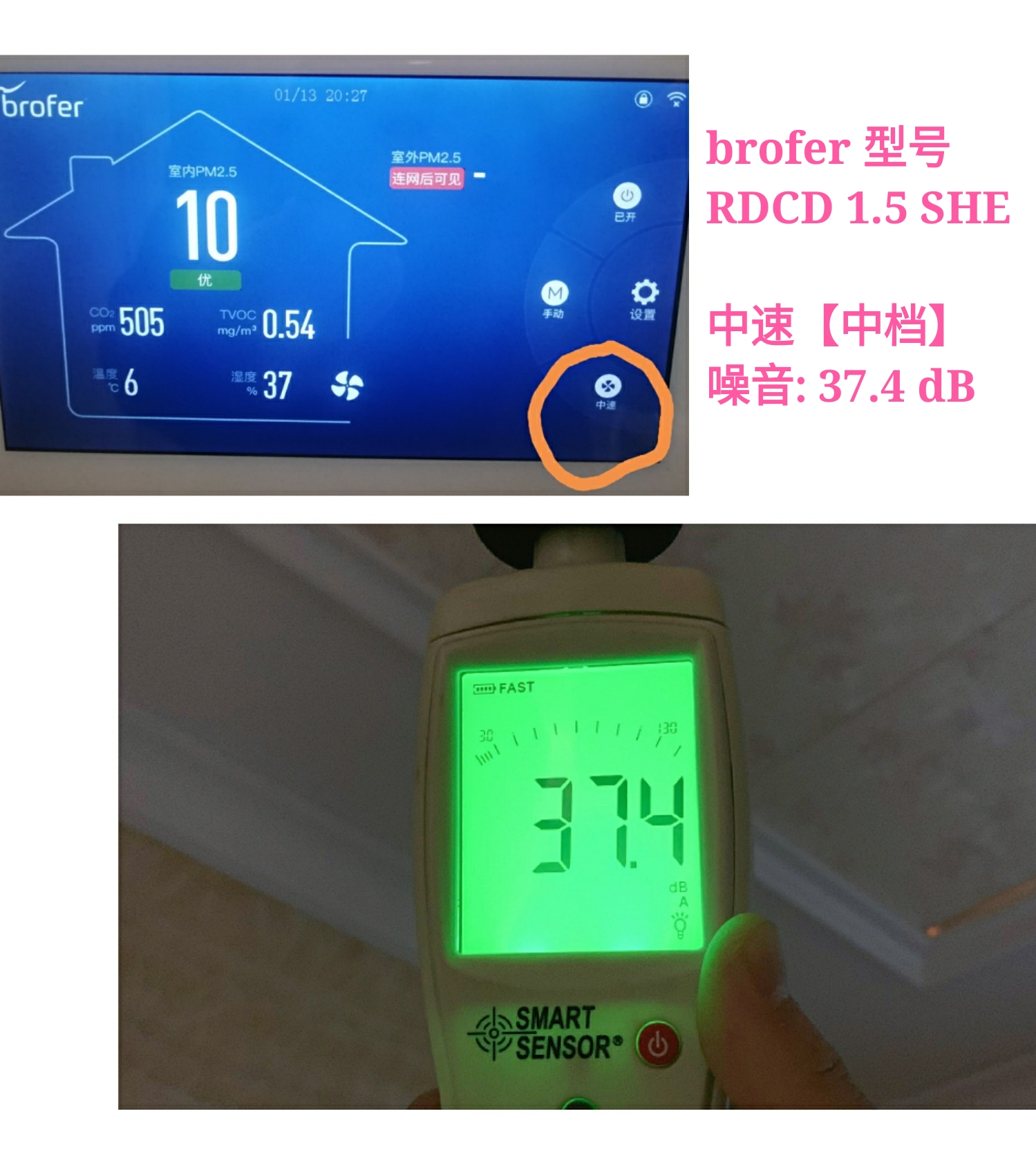 12月4日上午体验馆公司技术工程师实测brofer博洛弗RDCD1.5HE下方一米处噪音值:环境噪音为36.4分贝情况下,高档不超41分贝,低档不超37分贝,具体数据如下: