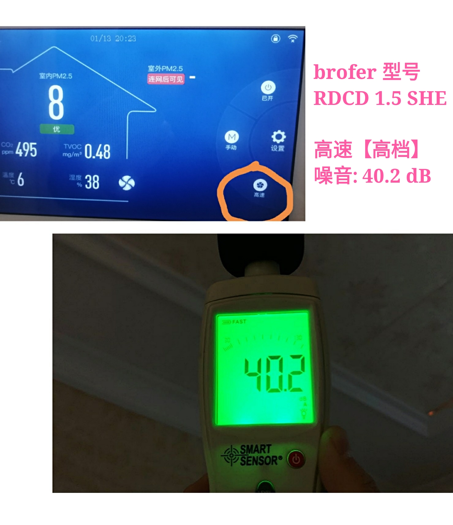 高档风量噪音为40.2分贝:
